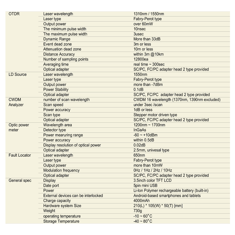 • Fiber optic line field service-5000 was developed to implement 5 functions such as OTDR, CWDM, Laser Soruce, Power Meter, Fault Locator in a single device.