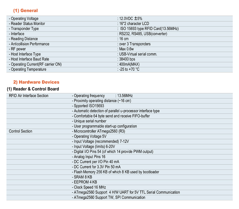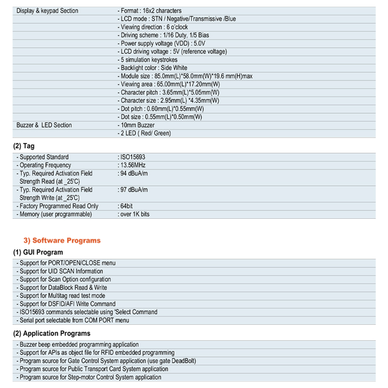 • It is configured to be compatible with Arduino. User can control RFID reader, LCD, LED, and Buzzer under Arduino board environment or by connecting directly to PC.